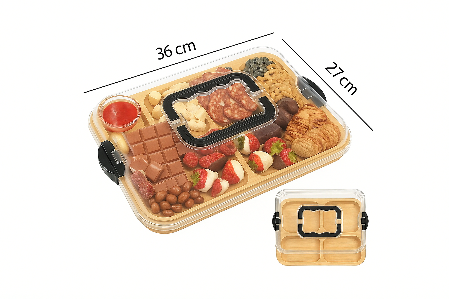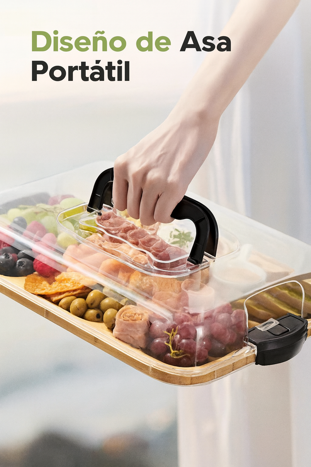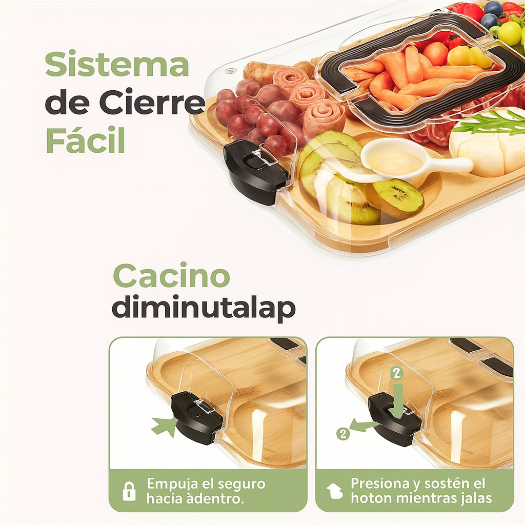 La Bandeja de Queso de Bambú con Tapa Acrílica combina elegancia y funcionalidad: hecha de bambú reciclado, con compartimentos para organizar tus snacks y una tapa acrílica segura que protege tu presentación.